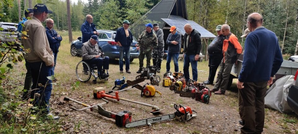 Äijät laavulla moottorisahan historiaan tutustumassa